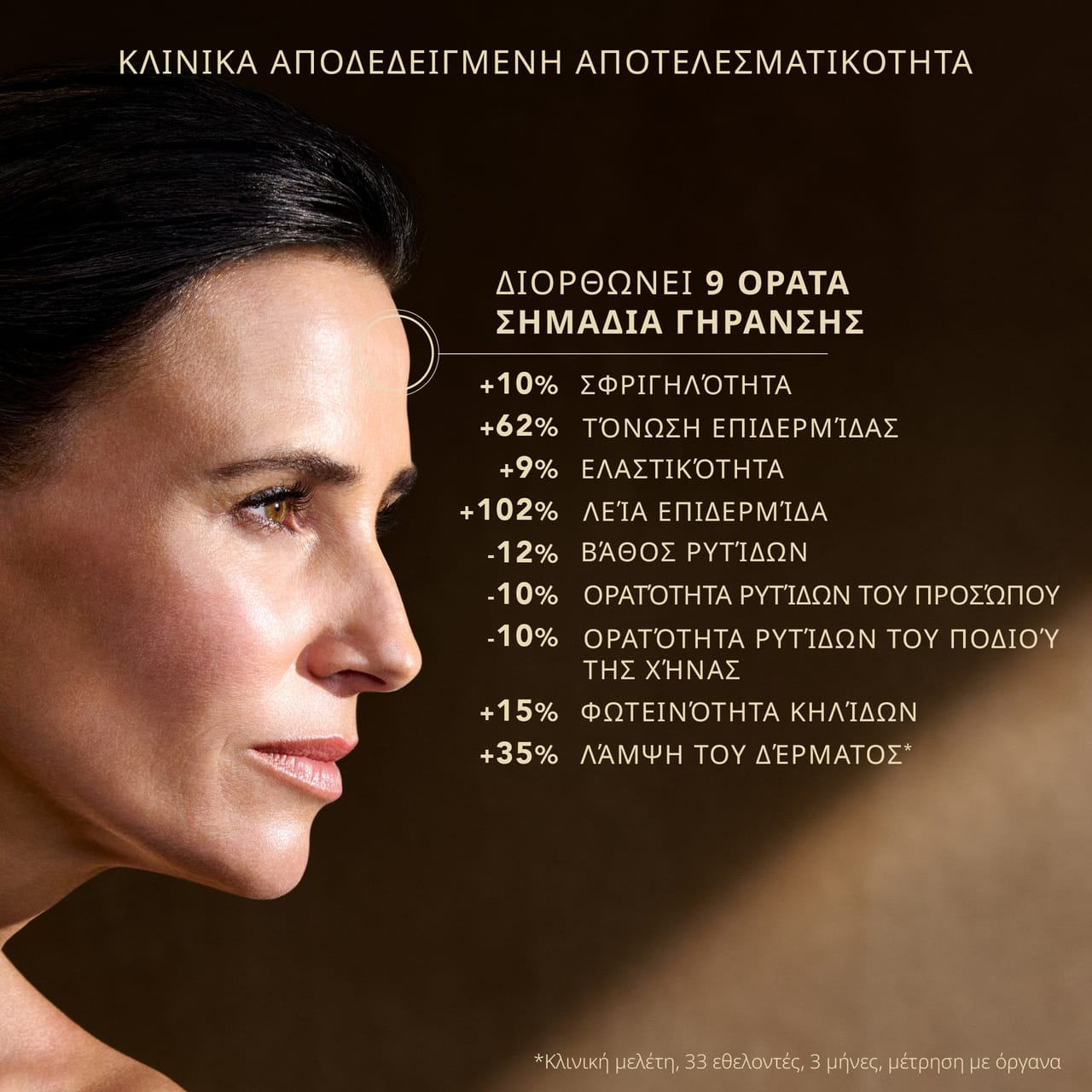 Η πιο ισχυρή* αντιγηραντική περιποίηση για τη διόρθωση 9 ορατών σημαδιών γήρανσης**: σφριγηλότητα, τόνωση επιδερμίδας, ελαστικότητα, ανομοιομορφία υφής, βάθος και ορατότητα ρυτίδων, ομοιομορφία χρώματος, κηλίδες και έλλειψη λάμψης.