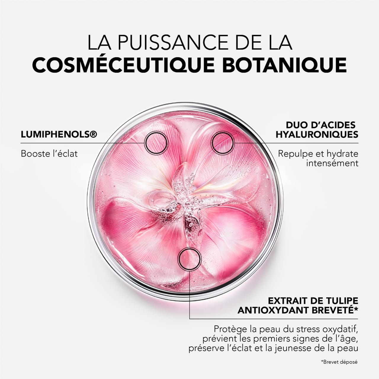 Στην καρδιά της σύνθεσης, οι Lumiphénols® boosters λάμψης διορθώνουν τις κηλίδες, προσφέροντας πιο ομοιόμορφο τόνο. Το duo υαλουρονικών οξέων υψηλού και χαμηλού μοριακού βάρους ενυδατώνει και επαναφέρει τον όγκο, ενώ το πατενταρισμένο αντιοξειδωτικό εκχύλισμα τουλίπας*, αποτέλεσμα 12 ετών έρευνας, διατηρεί τη λάμψη, ενισχύει τους φυσικούς μηχανισμούς άμυνας της επιδερμίδας και προλαμβάνει τα πρώτα σημάδια γήρανσης.