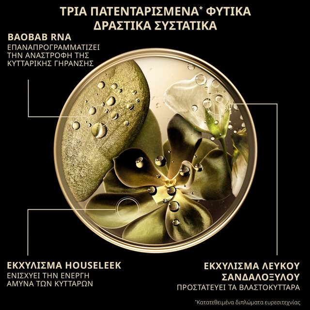 Στο επίκεντρο της σύνθεσής του βρίσκεται ένα τρίο πολύτιμων βοτανικών δραστικών συστατικών – εκχύλισμα λευκού σανδαλόξυλου, εκχύλισμα joubarbe, RNA από baobab – που ενεργοποιούν τις πρωτεΐνες-αγγελιοφόρους της κυτταρικής μακροζωίας*** για να διορθώσουν όλα τα σημάδια της γήρανσης. Σε συνδυασμό με τη νιασιναμίδη, ένα δερματολογικό δραστικό συστατικό, για ενισχυμένη αποτελεσματικότητα, και την παπαΐνη για να εξευγενίσει την υφή του δέρματος και να αναδείξει τη λάμψη της επιδερμίδας.