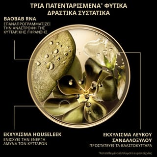 Στο επίκεντρο της σύνθεσής του βρίσκεται ένα τρίο πολύτιμων φυτικών δραστικών συστατικών — εκχύλισμα λευκού σανδαλόξυλου, εκχύλισμα houseleek, RNA από baobab — που ενεργοποιούν τις πρωτεΐνες-αγγελιοφόρους της κυτταρικής μακροζωίας** για να διορθώσουν όλα τα σημάδια της γήρανσης. Συνδυάζεται με νιασιναμίδη, ένα δερματολογικό δραστικό συστατικό, για ενισχυμένη αποτελεσματικότητα, και με συγκεντρωμένη παπαΐνη για απολέπιση, που λειαίνει την επιδερμίδα και αναδεικνύει τη λάμψη της.